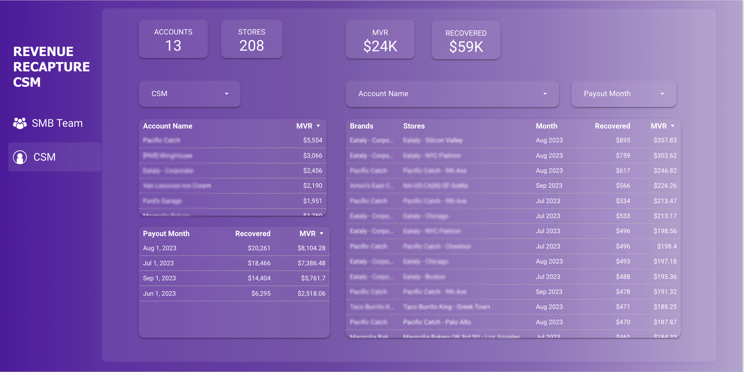 A focused, filterable dashboard that allows CSMs to manage and assess their portfolio of accounts utilizing the Revenue Recapture product. It offers insights into the commission (MVR) generated per customer and delineates the performance of individual locations within parent accounts. This empowers CSMs with actionable data to support their clients effectively during Quarterly Business Reviews (QBRs) and optimize restaurant operations.
