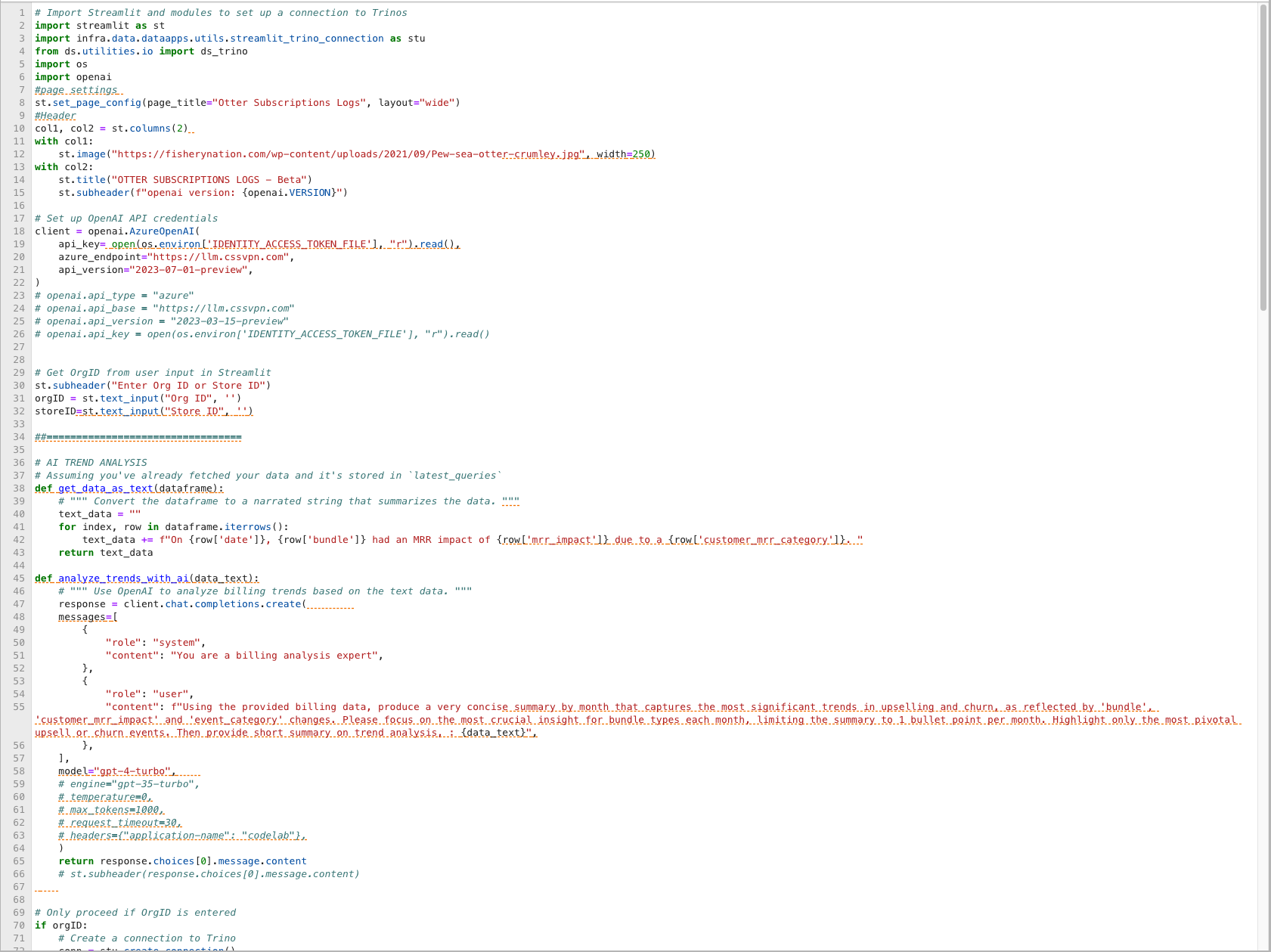 This project showcases my proficiency in advanced data integration and analysis within the Customer Success Operations field. By utilizing Trino SQL to pull detailed billing data, I transformed complex datasets into actionable insights using Jupyter Notebook for processing and Streamlit for an interactive display. The integration of Azure OpenAI further enhances this tool by automatically summarizing billing trends, offering clear visual indicators of account growth or contraction. This allows CSMs to quickly understand account dynamics and strategize accordingly to maximize customer retention and revenue growth.